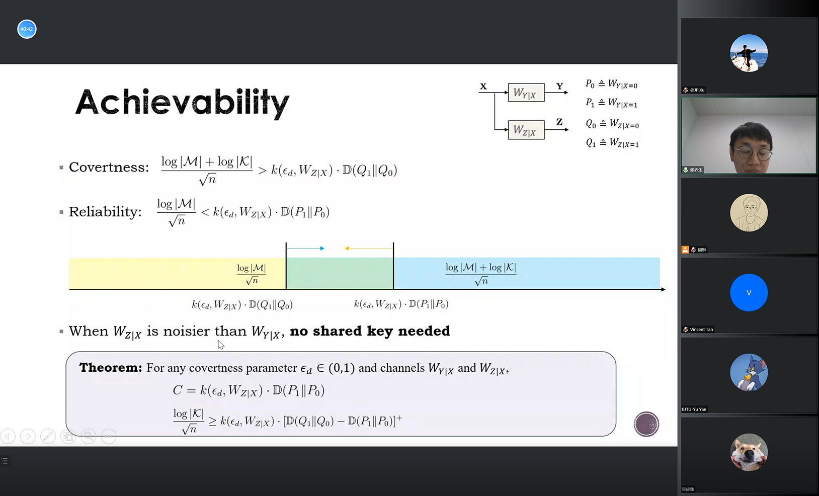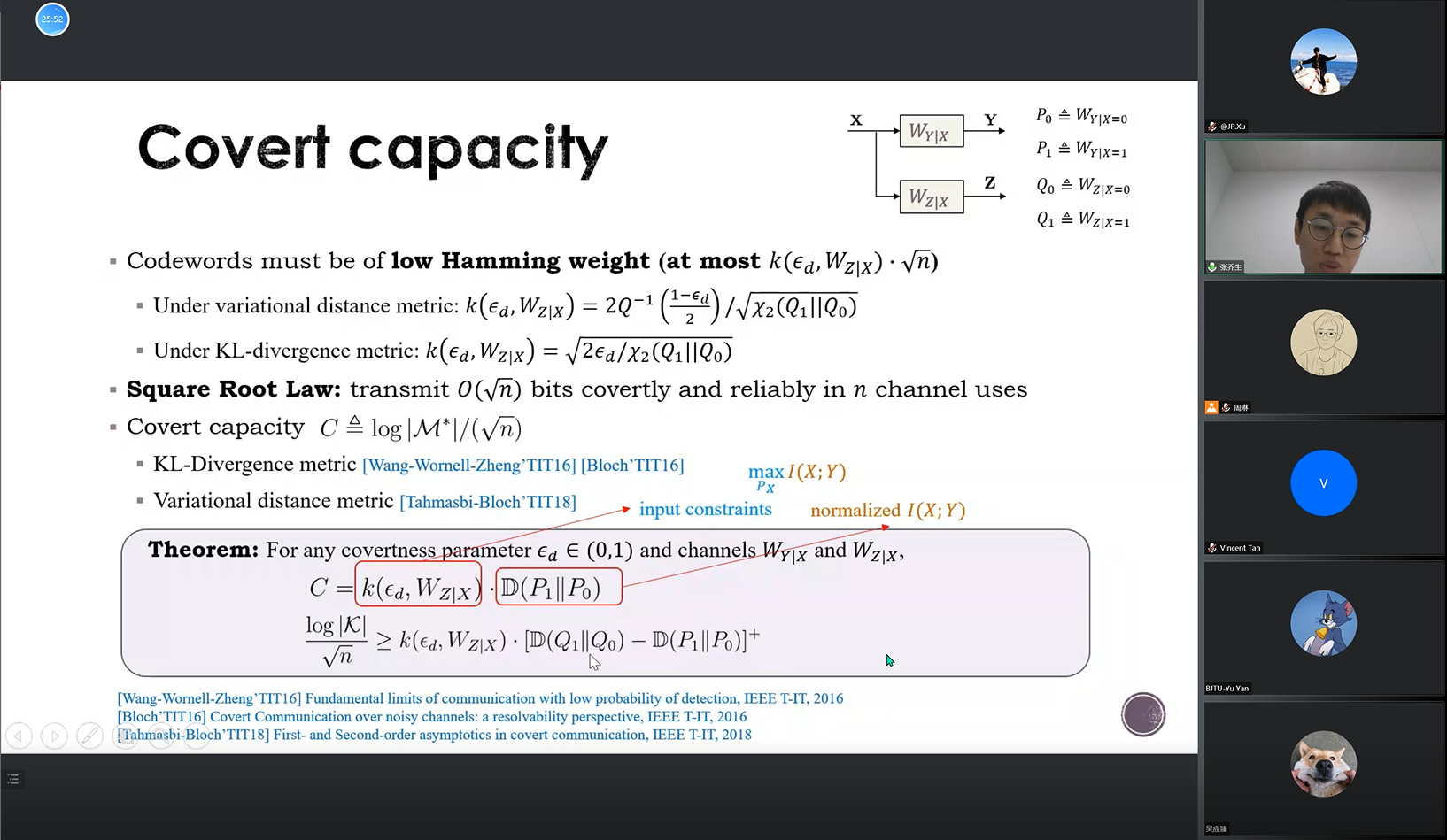 在报告中,张乔生博士首先介绍了信息论中隐蔽通信的研究背景,随后介绍了Bash,Wang,以及Bolch等人在二元离散无记忆信道(DMC)和高斯信道(AWGN)下隐蔽容量的经典结果,接着对隐蔽通信中的三个隐蔽度量Detection error probability、Variational distance、KL-divergence进行了介绍和分析,并给出了隐蔽通信码字需要满足的条件。此外,张博士介绍了IID码本、PPM码本、Gaussian码本以及BPSK码本实现隐蔽通信的编码可达性分析,并给出了隐蔽通信中是否需要密钥共享来保证隐蔽性的条件。接下来,张博士介绍了他本人在隐蔽通信领域的研究成果,包括:二元离散无记忆信道下多项式时间的编码策略、错配译码器场景下的隐蔽通信、窃听者存在主动攻击行为时的隐蔽通信以及隐蔽通信中的认证问题。