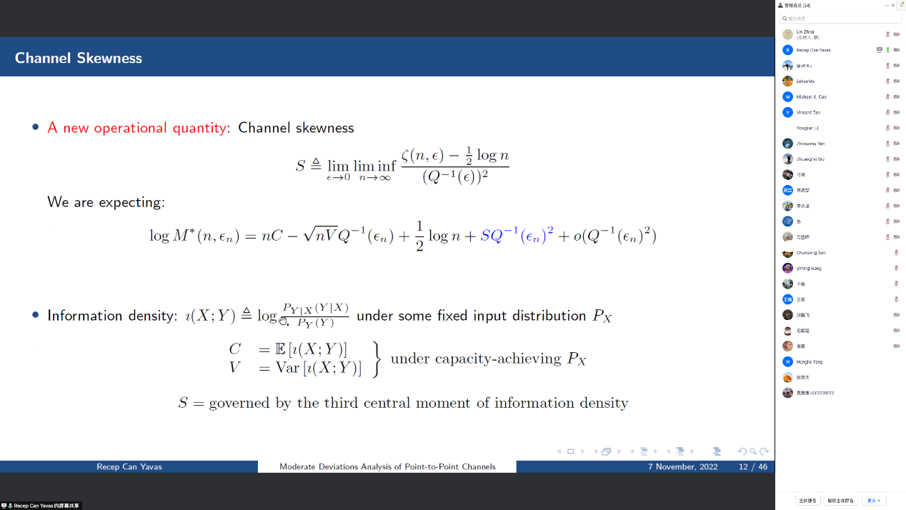 在报告中,Yavas博士首先介绍了未来超高可靠低时延场景下对于短码长通信的迫切需求,随后针对他所完成的三个研究工作内容进行了详细的展开。首先,Yavas博士针对点对点无反馈信道分析了moderate deviations下得到的非渐进界,在该工作中,Yavas博士提出了一种新的概念:channel skewness。Yavas博士的第二个工作考虑了点对点有反馈信道利用rateless通信策略的性能,指出上述信道的容量在仅部分比特后发送反馈信息和每位比特后都发送反馈信息的性能几乎接近。最后Yavas博士介绍了rateless通信策略在随机接入信道中应用后得到的可达界,其结果与已知用户数量多用户的通信场景中结论一致。