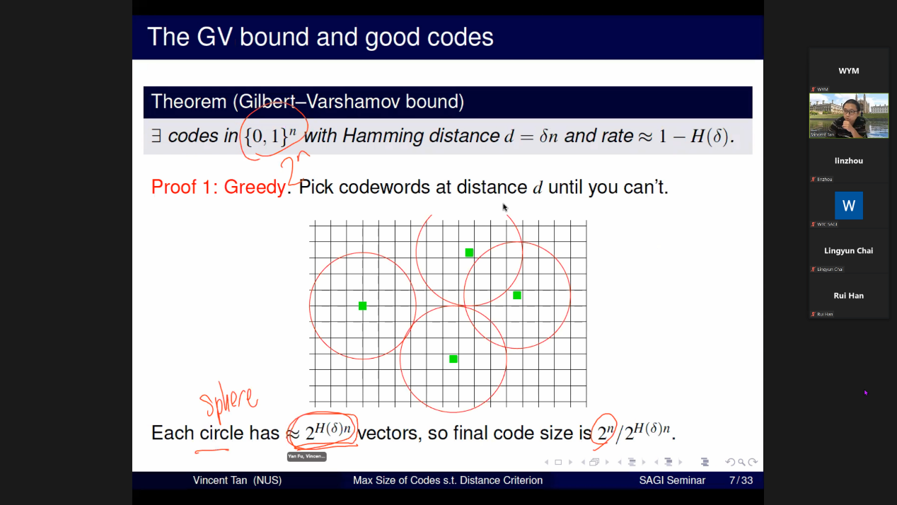 In the report, Prof. Tan first introduced the block codes and the relationship between the distance criterion and the coding rate, and reviewed the classical Gilbert-Varshamov (GV) bound. Then, Prof. Tan carefully explained the method of constructing the optimal coding scheme under the arbitrary distance criterion, and explained the detailed process for the case of discrete and continuous sources. Prof. Tan further conducted a second-order and large deviation asymptotic analysis of the main results, and revealed the performance of the optimal coding scheme from different perspectives.
